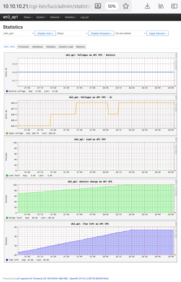 If we want to log UPS data, we might want to install the collectd module for the APC UPS (which also installs the collect daemon, if not yet existing). Furthermore, we can add the statistics app for LuCI, so we can check the history via the OpenWrt web page of the router: